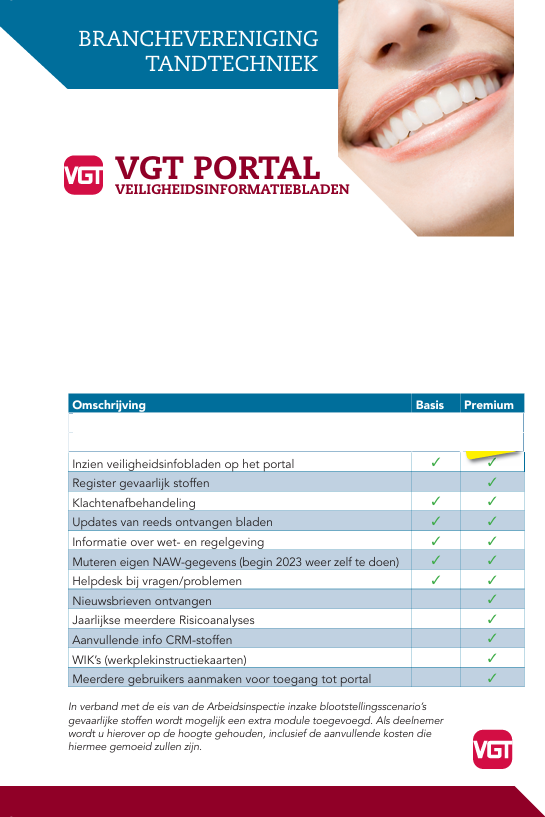 De informatie met betrekking tot de VIB’s wordt verstrekt via het VGT Portal Veiligheidsinformatiebladen: https://vib.dentalserviceportal.nl. Aangezien de regelgeving leveranciers verplicht een Veiligheidsinformatieblad gratis te verstrekken is dit precies waaraan het ‘gratis’ abonnement voldoet.